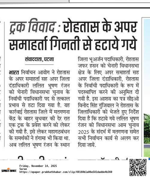 Action Taken: The Election Commission replaced him with the District Land Acquisition Officer, Rohtas, Zafar Hasan. The former ADM, Lalit Bhushan Ranjan, has been separated from all election duties, including the counting, in the context of the 2025 General Assembly Elections.