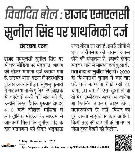 3)"RJD MLC Sunil Singh FIR": An FIR has been filed against RJD MLC Sunil Singh for an inflammatory statement made on social media regarding the vote counting.